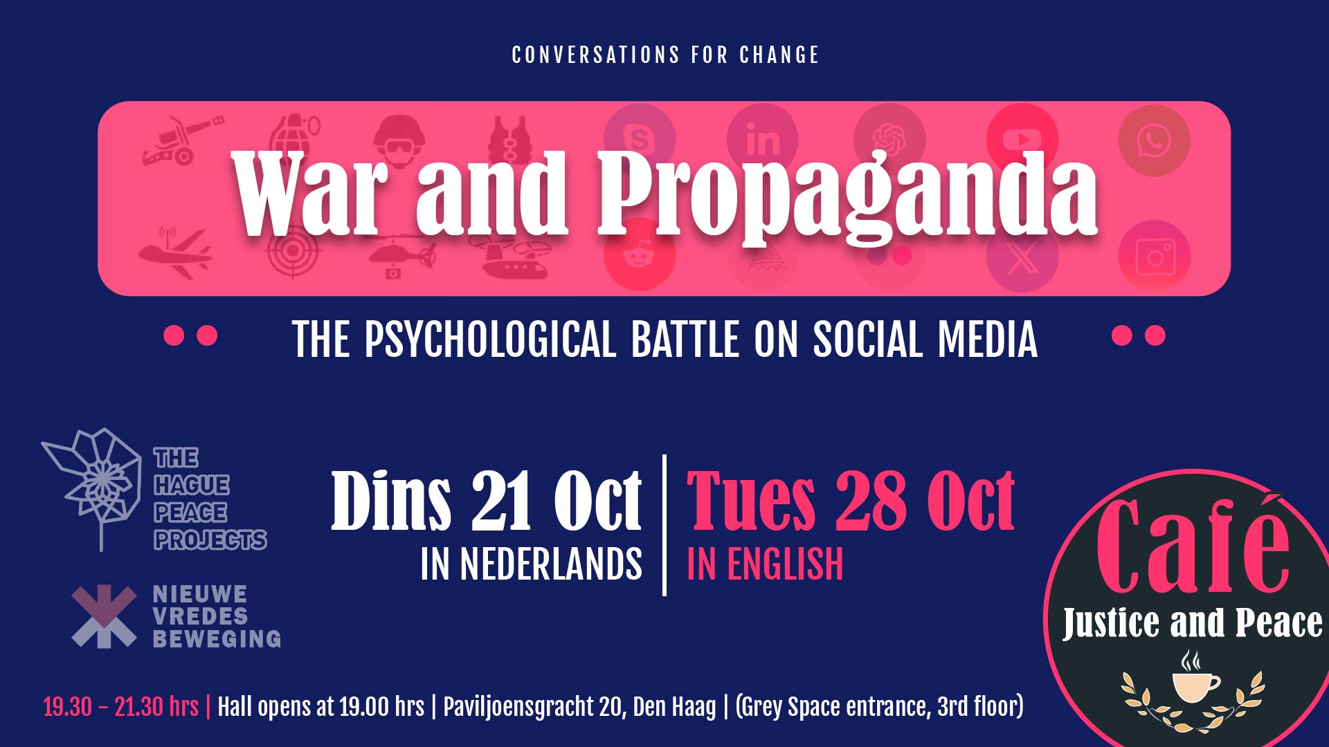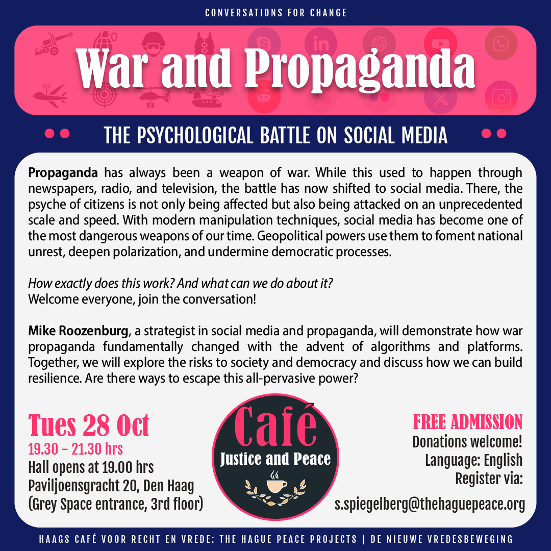 Cafe Justice and Peace is an initiative of The Hague Peace Projects and De Nieuwe Vredesbeweging